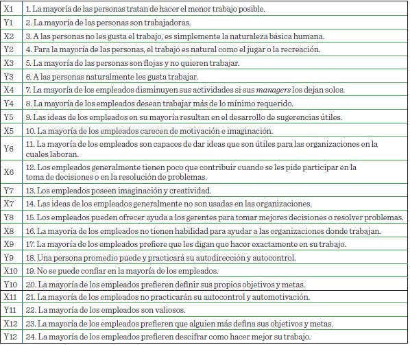 1. Teoría X (12 reactivos) en escala tipo Likert, con 5 puntos de rango (1. Totalmente en desacuerdo - 5. Totalmente de acuerdo) (Tabla 2).
