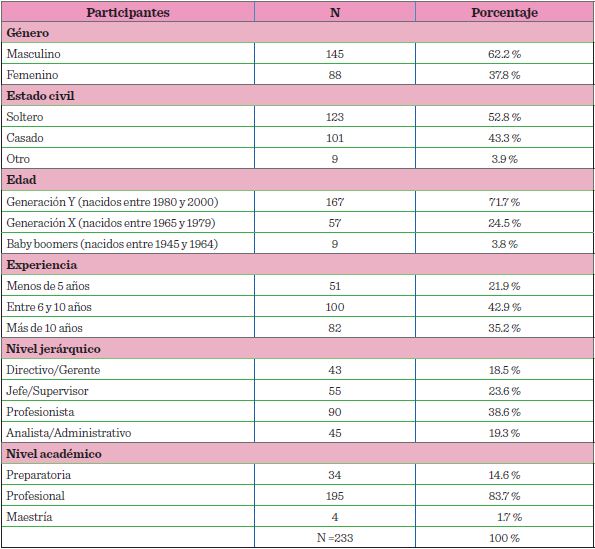 Durante las últimas dos semanas del mes de agosto de 2015, se aplicó una encuesta a una muestra de 233 personas profesionistas que trabajaban formalmente en empresas de la zona metropolitana de Monterrey. Las encuestas fueron desarrolladas en el portal electrónico Survey Monkey. La participación en la respuesta de las encuestas fue de manera anónima. El sistema estadístico utilizado para el análisis de la información obtenida fue Statistical Package for the Social Science (SPSS) versión 24.0, realizando un análisis factorial exploratorio, con la finalidad de conocer la confiabilidad de constructo de las diferentes variables del instrumento de medida, y un análisis descriptivo de los diferentes ítems o indicadores de las variables de la investigación, así como el IBM SPSS Amos versión 21, para hacer los análisis de los datos con el esquema de modelos estructurales.