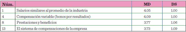 Una vez realizado el proceso de las pruebas de confiabilidad, se procedió a hacer un análisis descriptivo de las variables de la investiga ción. En lo que respecta a la forma de retribuir al personal; en el nivel de importancia que le dieron las personas a los diversos factores monetarios, la compensación variable (bonos por resultados) fue la más relevante (MD = 4.09, DS = 1.00) (Tabla 6).