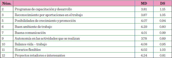 En el caso de los factores no monetarios, se puede observar que los trabajadores le otorgaron mayor importancia al buen ambiente de trabajo (MD = 4.29 DS = 0.80) (Tabla 7).