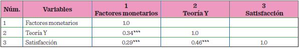 En lo que respecta a los índices de correlación (Tabla 8), existen relaciones positivas entre las variables del modelo, las cuales, aun que de nivel bajo, fueron significativas. Los factores monetarios y la teoría Y mostraron como resultado r= 0.34, P < 0.001, mientras que la teoría Y con la satisfacción presentó un coeficiente r= 0.46, P < 0.001. Finalmente, la satisfacción con los factores monetarios presentó una relación positiva r = 0.29, P < 0.001. Es importante mencionar que no se encontró relación entre los factores monetarios con las variables de la teoría X.