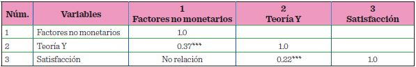 Continuando con el análisis de los datos, se realizó la prueba de confiabilidad de cada uno de los 51 ítems utilizados en el instrumento de medida. De la matriz resultante, se pudieron observar cargas factoriales superiores a 0.45, tal como se esperaba, es decir, estadísticamente aceptables, obteniendo para las cinco variables de satisfacción un alpha de Cronbach de 0.767; para las doce variables de la teoría X se obtuvo un alpha de Cronbach de 0.859. Se observó que tres variables de la teoría Y (Y6, Y7 y Y8: Tabla 2) no mostraron cargas factoriales que fueran estadísticamente aceptables, quedando únicamente nueve con un alpha de Cronbach de 0.805, confirmando la validez y la confiabilidad de los constructos para poder utilizarlos en el contexto hispanoparlante. Para las formas de retribuir al personal, es decir, las compensaciones, desde el punto de vista monetario, las cuatro variables resultaron con cargas favorables y se obtuvo un alpha de Cronbach de 0.797, mientras que para los factores no monetarios (9), el factor once no presentó cargas factoriales aceptables, por lo cual se tuvo que eliminar y se obtuvo un alpha de Cronbach de 0.902.