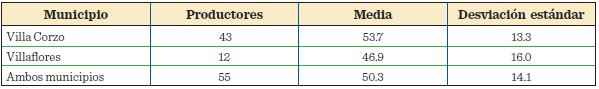La edad promedio de los productores entrevistados en este trabajo fue de 50.3 años (Tabla 1), no obstante, se observó diferencia entre las medias de los municipios de Villaflores y Villa Corzo, 46.9 años y 53.7 años, respectivamente.