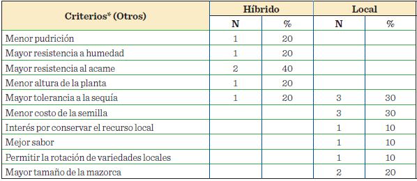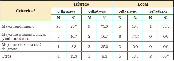 La decisión de elegir entre maíces locales e híbridos, por parte de los productores en este trabajo, se sustentó principalmente en tres criterios: 1) mayor rendimiento; 2) mayor resistencia a plagas y enfermedades tales como gusano cogollero (Spodoptera frugiperda (J. E. Smith), picudo Sitophilus oryzae (L.) y el complejo mancha de asfalto (Phyllachora maydis, Monographella maydis y Coniothyrium phyllachorae) y; 3) mejor precio (de venta) del grano (Tabla 4).