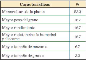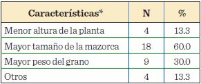 Las características empleadas para la selección de las semillas de los maíces locales son basados principalmente en las características de la mazorca, dentro de estos se encuentran: mayor tamaño de la mazorca (60.0 %), mayor peso del grano (30.0 %), y otros (13.3 %), como mazorcas cortas, bien cubiertas con mayor tamaño de granos, granos llenos y grosor del olote. Mientras que un pequeño porcentaje también considera las características referidas a las plantas como es menor altura de la planta (13.3 %) (Tabla 7); datos similares a los reportados por Herrera y col. (2002), y a los de Díaz-Bautista y col. (2008), en la selección de semilla de haba. De acuerdo con lo antes mencionado, se observó una clara necesidad, por parte de los productores, de mejorar algunas características agronómicas, dentro de las que destaca la altura de la planta (53.3 %). No obstante, realizan prácticas que privilegian a otras características, como es el tamaño de mazorca (60 %), lo cual ha influido en el mejoramiento lento de las variedades locales.