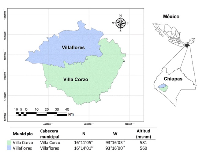 El estudio se realizó en el ciclo agrícola primavera-verano, que comprende los meses de mayo de 2015 a febrero 2016. Abarcó los municipios de Villa Corzo y Villaflores, que forman parte de la región Frailesca de Chiapas, localizada entre la llanura costera del océano Pacífico y la depresión central de Chiapas. La región se caracteriza por su importante actividad agrícola, en especial, su alta producción de maíz; la cual no depende de grandes productores con tecnología avanzada, sino, a nivel de región, como de municipios, predominan los pequeños y medianos productores (Guevara y col., 2013).