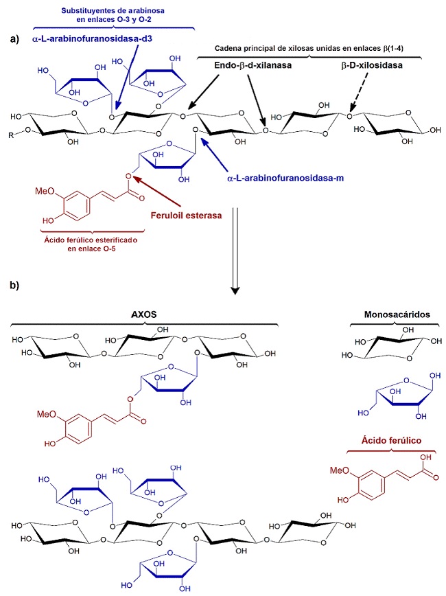 Los AXOS son cadenas cortas de unidades de xilosa sustituidas con unidades de arabinosa, las cuales pueden estar esterificadas a ácido ferúlico, que se producen por degradación de los AX (Figuras 1a, 1b). La hidrólisis de los AX y los AXOS puede llevarse a cabo durante el procesamiento de los cereales, para transformarlos en productos alimenticios, debido a la presencia de enzimas endógenas que los degradan. Los AX y AXOS que permanecen en los alimentos pueden ser hidrolizados en el colon de los animales y humanos, por efecto de la microbiota endógena o natural, que produce enzimas como endo-β-D-xilanasa, β-D-xilosidasa, a-L-arabinofuranosida-d3, a-L-arabinofuranosida-m y feruloil esterasa. La endo-β-D-xilanasa rompe de manera aleatoria los enlaces glucosídicos interiores de la cadena lineal de unidades de xilosa y la β-D-xilosidasa corta el enlace glucosídico de la unidad terminal de xilosa (Figura 1a). Por su parte, las a-L-arabinofuranosidasas hidrolizan los enlaces de ramificación entre las unidades de xilosa y arabinosa. En contraste, las feruloil esterasas cortan los enlaces entre las unidades de arabinosa y ácido ferúlico. El resultado de la actividad enzimática en conjunto produce la disminución del peso molecular (PM) de los AX, produciendo AXOS y xilo-oligosacáridos, y finalmente monosacáridos (Figura 1b) (Grootaerty col., 2007).