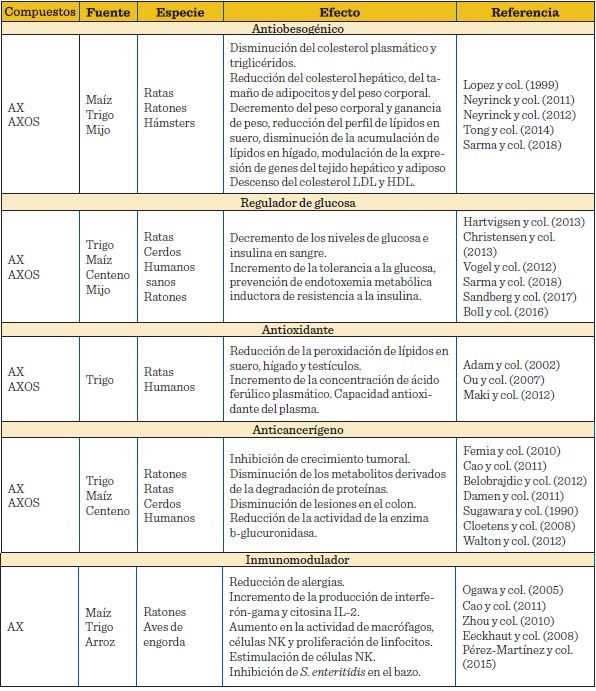 Broekaert y col. (2011), sugirieron que el efecto de los prebióticos en la modulación de la microbiota intestinal no es prueba por sí misma de los efectos benéficos, excepto cuando dicha modulación involucra la disminución de bacterias patógenas y sus efectos dañinos. Sin embargo, esta sugerencia no considera que los prebióticos puedan actuar estimulando selectivamente la actividad de algunos organismos produciendo sustancias benéficas que impactan los procesos del cuerpo, como son el tránsito intestinal, las funciones inmunitarias, el metabolismo de lípidos, el metabolismo energético y la inhibición del desarrollo de tumores, entre otros. En ese sentido, los resultados obtenidos, en los estudios sobre la ingesta de los AX y los AXOS, han puesto de manifiesto la congruencia de ser considerados como promotores de la buena salud, ya que se les ha asociado como posibles agentes reductores de colesterol (Adam y col., 2001), antioxidantes (Ou y col., 2007), antitumorales y benefactores del sistema inmune (Cao y col., 2011) (Tabla 1).