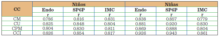 Por otra parte, se detectó una buena correlación de todos los sitios de medición de la CC, respecto a la Endo, SP6P e IMC, con valores de rho de Spearman por arriba de 0.780 (Tabla 2). Por otra parte, se desarrolló un modelo de regresión múltiple, utilizando el método Backward, donde se ingresaron los cuatro sitios de medición de CC como variables predictoras de los indicadores de obesidad Endo, SP6P e IMC. En el grupo de los niños, la CCI fue el sitio que mostró mejor capacidad predictiva para los tres indicadores: IMC (R2 = 0.915, P = 0.001), Endo y SP6P (R2 = 0.905, P = 0.001 en ambas). En las niñas, la CCI también fue el sitio que mejor predijo la Endo, la SP6P y el IMC (P = 0.001 en todas) con una R2 = 0.882, 0.926 y 0.880 respectivamente (Tabla 3). En las Figuras 1a y 1b se visualiza la relación de la CCI respecto a la Endo, SP6P e IMC por sexo.
