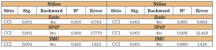 Se realizó un modelo estadístico de regresión lineal múltiple, con el método de backward, para determinar cuál CC tenía mayor relación con la magnitud adiposa de los escolares evaluados, identificando la Endo, la SP6P e IMC como indicadores de obesidad.