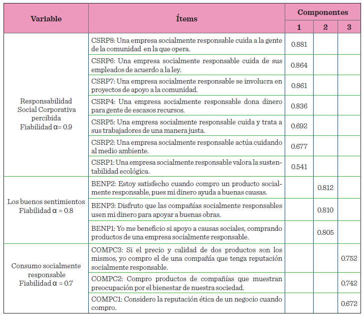 Se realizó el análisis factorial exploratorio por componentes principales. La rotación utilizada fue oblimin directo, respaldados en el argumento de que los estudios de comportamiento y motivaciones sociales se correlacionan y pueden covariar (Prochaska y col., 1994; Freestone y McGoldrick, 2008; Hernández, y col., 2012). Se indicó extraer los factores por encima del auto valor, descartando los ítems cuyas cargas factoriales estuvieran por debajo del 0.49. Solo un ítem perteneciente a la escala de RSC percibida se agrupó en dos factores, y por tal motivo, se eliminó (CSRP3: Una empresa socialmente responsable dona una parte de sus ganancias a la caridad, de manera regular) (Tabla 1).