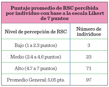 En el análisis descriptivo del estudio, se observó que la mayor parte de la muestra cuenta con una percepción de RSC de media a alta (este dato fue obtenido con base en una clasificación del promedio de las respuestas de la escala de “percepción de la RSC” de cada encuestado. Esto es, la sumatoria de los puntajes asignados a cada ítem de la escala de RSC percibida, dividido entre siete, que corresponde a los puntos de la escala Likert utilizada). La clasificación atiende a tres niveles: bajo nivel de percepción de RSC (1 - 2.3 pts.), medio nivel de percepción de RSC (2.4 - 4.6 pts.) y alto nivel de percepción de RSC (4.7 a 7 pts.) (Tabla 3). Sin embargo, al reproducir el modelo de mediación, esta percepción solo logra incidir en un 10 % (R2 = 0.10, P ≤ 0.05), sobre el consumo responsable, de forma directa. Esto implica que, la incidencia de la percepción de la RSC, sobre el comportamiento de consumo responsable, se debe principalmente a la intervención de otras variables mediadoras. Algunas de estas variables mediadoras incluyen buenos sentimientos (Andrews y col., 2014), precio justo percibido (Habel y col., 2015), reputación (Maden y col., 2012), confianza (Vlachos y col., 2009), identificación con la empresa (Martínez y Rodríguez, 2013).