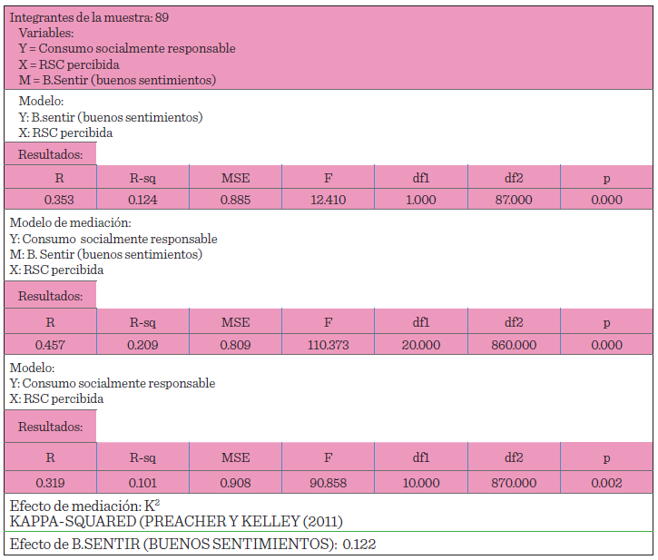 La RSC percibida también mantiene efectos explicativos positivos y significativos moderados para con la variable de buenos sentimientos (R2 = 0.12, P ≤ 0.05) (Figura 2). Por su parte, los buenos sentimientos incrementan el efecto predictor del comportamiento de consumo responsable de una R2 = 0.10 a una R2 = 0.21, cuando se incluye como una variable mediadora, siendo también un efecto positivo y significativo que, además absorbe parte de la significancia de la RSC percibida sobre el consumo responsable. La K2, que corresponde al efecto de mediación, fue de 0.12. (Figura 2). Estos resultados (Tabla 4) son similares a los efectos mediadores encontrados por la variable buenos sentimientos sobre el comportamiento responsable de los consumidores de otros países (Andrews y col., 2014; Habel y col., 2015).
