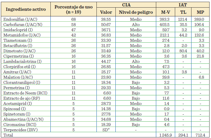 Para calcular el impacto ambiental, de los plaguicidas identificados en este estudio, se utilizó el modelo del CIA. Esta metodología se compone de dos módulos: 1) El valor del CIA, que indica el peligro o potencia/l inherente del i.a. de un plaguicida específico de causar daño al medio ambiente y la salud humana; y 2) El CIA de uso en campo (CIAC), que considera el valor del CIA y los factores de exposición del plaguicida, para indicar el riesgo de causar un daño real, es decir, el potencial impacto ambiental y sanitario (FAO, 2008).