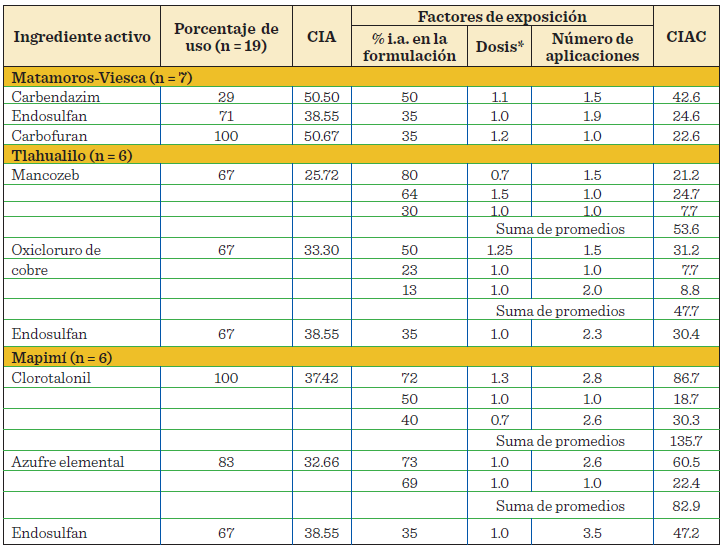 Los resultados de este trabajo muestran que la toxicidad inherente de un plaguicida, considerado como el nivel de peligro, difiere de su riesgo potencial de daño al medio ambiente y la salud humana cuando se consideran factores de exposición o variables de uso en campo (porcentaje de i.a. en la formulación, la dosis y el número de aplicaciones). En la Tabla 4 se observan los i.a. de nivel de peligro medio, como endosulfan, que se empleó al 35 % en una dosis promedio de 1 L/ha en el 71 % de los programas, en Matamoros-Viesca, en 67 % en Tlahualilo y en 67 % en Mapimí. Sin embargo, los valores del CIAC en Tlahualilo (30.4) y en Mapimí (47.2) fueron mayores que el de Matamoros-Viesca (24.6), donde se utilizó en más programas. Esto, debido al mayor número promedio de aplicaciones en Tlahualilo (2.3) y Mapimí (3.5), respecto a Matamoros-Viesca (1.9). Por otro lado, mancozeb en Tlahualilo, así como clorotalonil y azufre elemental en Mapimí, se emplearon en productos con diferentes concentraciones del i.a. en la formulación, y se realizaron más aplicaciones de los productos con la concentración del i.a más alta. El oxicloruro de cobre también se utilizó en productos con diferentes concentraciones de i.a. en Tlahualilo. En este caso, el valor del CIAC más alto (31.2) dependió más del uso de mayores dosis promedio (1.25 kg/ha) de los productos con la concentración de i.a. más alta (50 %), que del número de aplicaciones.