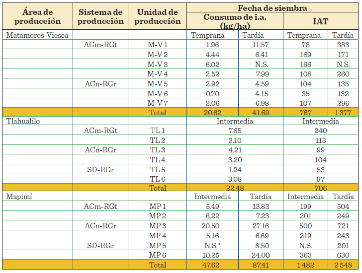 En Mapimí, los sistemas de producción con ACn-RGr y SD-RGr ejercieron mayor presión ambiental que aquellos con ACm-RGt. Los valores de IAT variaron de 199 a 500 unidades, en fechas de siembra intermedias y de 201 a 721 unidades, en fechas tardías (Tabla 5).