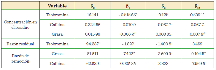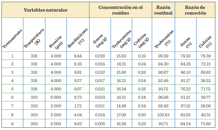 Se realizó un análisis de varianza (ANOVA) de las variables de estudio en el residuo (teobromina, cafeína y grasa), la razón residual (teobromina) y de remoción (grasa y cafeína), como función de la temperatura y presión, durante la extracción con CO2 supercrítico. Adicionalmente, la viabilidad del modelo se comprobó con el coeficiente de determinación R2.