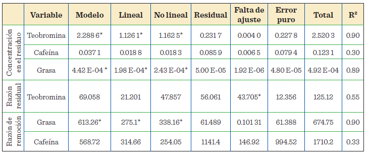 La Tabla 3 muestra que las variables: concentración en el residuo de teobromina y grasa fueron significativos (P ≤ 0.05), con efectos de forma lineal y no lineal por causa de interacción entre los mismos. La prueba de falta de ajuste reveló que el modelo seleccionado es confiable para describir los datos observados en el residuo de teobromina y grasa (P ≤ 0.05). Además, la viabilidad del modelo se comprobó con el coeficiente de determinación R2, de 0.89 y 0.90, respectivamente.