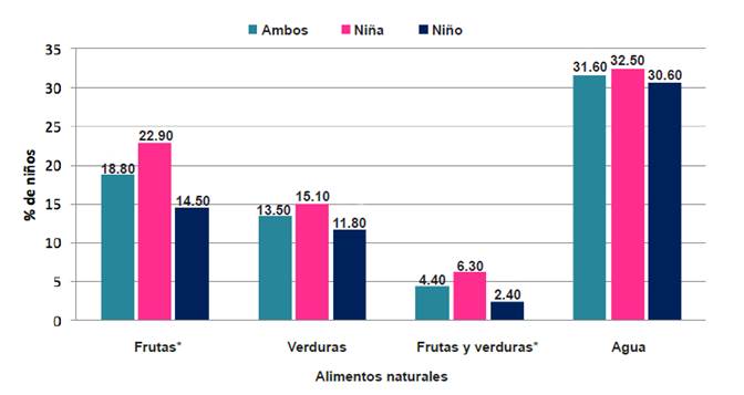 En la Figura 1 se puede observar que, entre los alimentos seleccionados, para los refrigerios de los niños, en ambos sexos, no es frecuente el consumo de frutas (18.80 %), verduras (13.50 %) y agua (31.60 %). Al comparar entre sexos, las niñas llevaron más frutas que los niños (P < 0.01), al igual que la combinación de frutas y verduras (P < 0.05). Solo el 4.4 % de la muestra total llevó tanto fruta como verdura. Al considerar frutas y verduras juntas, se observó un resultado mayor (32.3 %) que el de Sweitzer y col. (2009), quienes reportaron que el 29 % de los niños evaluados llevaron fruta y/o verdura en sus refrigerios. Hubbard y col. (2014), reportaron que niños de Massachusetts (EE. UU.) llevaron agua (28 %), verduras (11 %) y frutas (34 %) en los refrigerios, siendo mayor el contenido de frutas, comparado con este estudio. Por otra parte, Evans y col. (2010), documentaron que el 19 % de niños estudiados del Reino Unido llevó verduras/ensalada, 53.6 % fruta y el 30.7 % alguna bebida permitida (agua, leche, jugo de fruta). Por otro lado, en un estudio realizado en niños de Sudáfrica, se registró que solo el 1 % llevaron en sus refrigerios fruta, debido a que la población sudafricana tiene una baja ingesta de verduras y frutas (Faber y col., 2014). En los estudios analizados, se puede observar que hay preferencia por las frutas en comparación con las verduras.