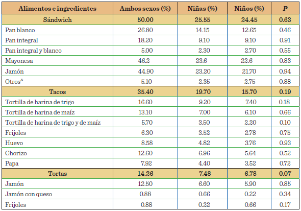 En la Tabla 2 se reporta que los alimentos preparados con mayor frecuencia fueron sándwiches (50.00 %), seguido de tacos (35.40 %) y tortas (14.26 %), sin observarse diferencia al comparar por sexo. Para la preparación del sándwich, utilizaron principalmente el pan blanco (26.80 %) y pan integral en menor proporción (18.20 %). Cabe mencionar que el 44.90 % de los escolares le añadieron jamón al sándwich. Resultados similares reportaron Hubbard y col. (2014), en un estudio transversal realizado en EE. UU. (Massachusetts), en donde mencionaron que el sándwich fue el alimento preparado que llevaron de casa con mayor frecuencia (59 %). En la categoría plato mixto (burritos/tacos), solo el 4 % llevó estos alimentos. Así mismo, Vargas y col. (2013), registraron en un estudio realizado en Tijuana, México, que durante el refrigerio, los niños llevaron principalmente sándwiches (27 %). Santos y col. (2015), mencionaron que el 55 % de los niños llevaron en sus refrigerios tortas o sándwiches.