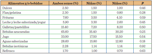 En cuanto a la frecuencia de alimentos y/o bebidas procesados o industrializados, en los refrigerios de los escolares se documentó que las galletas o pastelitos (15.40 %) y las bebidas azucaradas (BA) (65.60 %) fueron las que llevaron con mayor frecuencia. Las frituras, flan/gelatina, dulces, leche/leche saborizada y yogur, fueron las de menor frecuencia. Entre las BA más consumidas estuvieron el jugo (33 %) y el agua saborizada como Nestlé®, Jumex®, Paupau® y Frutier® (28.6 %), sin observarse diferencia entre sexos (Tabla 3). Evans y col. (2016), reportaron cifras similares a este trabajo en BA (62.1 %), pero cifras mayores en la selección de yogur (63.9 %) y leche (57.7 %). Mientras que Vargas y col. (2013), indicaron que los alimentos que los escolares llevaron de casa, para comer en la escuela, fueron galletas y pasteles (55 %), bebidas endulzadas (48 %), leche endulzada (48 %), yogur (41 %), leche (40 %), dulces (35 %) y leche saborizada (18 %). Neilson y col. (2016) y Roberts-Gray y col. (2016), confirmaron que los refrigerios son ricos en grasas saturadas, azúcares y sodio, al contener principalmente alimentos densamente energéticos, como BA, botanas, confitería. Lo anterior muestra que las BA o endulzadas tienen una alta frecuencia en los refrigerios de este y de otros estudios.