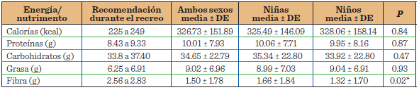 El equilibrio de energía y macronutrientes del contenido de los refrigerios de los escolares no se cumplió, toda vez que las calorías (326.73 kcal), proteínas (10.01 g), y grasas (9.02 g), sobrepasaron las recomendaciones del lineamiento; mientras que la fibra tuvo un valor bajo (1.50 g); solo los carbohidratos (34.65 g), estaban dentro de lo adecuado (SEP, 2014). La preferencia de alimentos refinados, como el pan blanco, tortilla de harina de trigo y bolillo, podría estar asociada con el bajo contenido de fibra en los refrigerios, ya que hubo escasa presencia de frutas, verduras y leguminosas, que son buena fuente de fibra. Las niñas consumieron más fibra que los niños (P < 0.05) (Tabla 4).