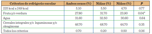 Al comparar el contenido de los refrigerios con los criterios de la SEP (2014), se observó que únicamente el 5.10 % cumplió con el criterio de escoger alimentos con un contenido de entre 225 kcal a 249 kcal, el 27.80 % consumió fruta y/o verdura, el 46.70 % cereales integrales. Solo el 0.70 % de los niños cumplieron con todos los criterios (cereales integrales, oleaginosas y/o leguminosas, frutas, verduras y agua) (Tabla 5). Por su parte Vargas y col. (2013), registraron que solo el 23 % de los refrigerios escolares evaluados en niños de Tijuana cumplieron los lineamientos establecidos por la SEP, pero indicaron que cuando se consideró el criterio de incluir agua, solo el 8 % cumplía con esta categoría. Resultados similares reportaron Medina-Montaño y col. (2012) en escolares de Guadalajara, Jalisco, donde el contenido de energía en los refrigerios fue de 340 kcal, superando las recomendaciones de la SSA/SEP (2010).