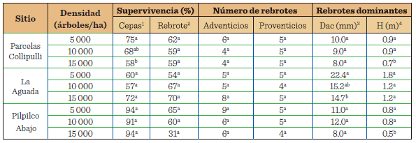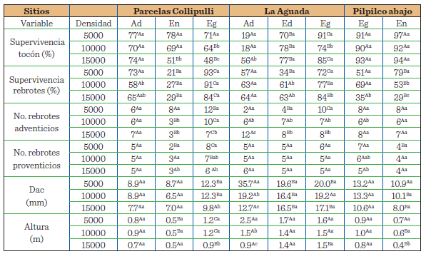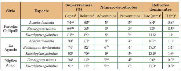 Por otra parte, en el sitio Parcelas Collipulli, la especie Eucalyptus globulus presentó la mayor tasa de supervivencia del rebrote (89 %) en las tres densidades, a partir de los tocones obtenidos de los árboles cosechados a los dos años, que le permitió superar de forma significativa a Eucalyptus nitens y Acacia dealbata, con 25 % y 65 %, respectivamente (Tabla 2). En los otros dos sitios, todas las especies incluidas en el estudio presentaron valores estadísticamente iguales para la proporción de tocones que mostraron rebrotes, con valores entre 52 % y 78 %.