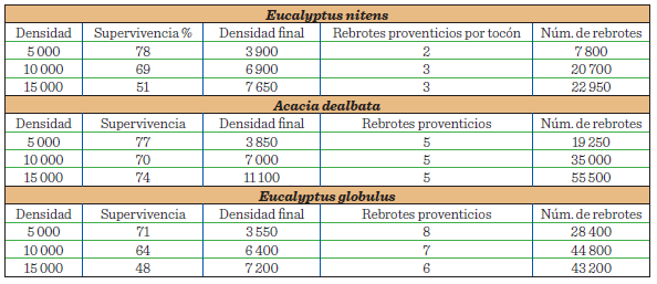 En Parcelas Collipulli, la densidad de plantación más favorable para Acacia dealbata fue en la de 5 000 árboles/ha, con un 77 % de supervivencia de tocones, seguida por la densidad más alta de 15 000 árboles/ha, con un 74 %. Los eucaliptos, -especialmente Eucalyptus nitens- mostraron valores de supervivencia similares a los observados en Acacia dealbata en las densidades de 5000 árboles/ha y 10 000 árboles/ha. En la densidad de 15 000 árboles/ha se redujo significativamente la supervivencia en Eucalyptus nitens (51 %) y Eucalyptus globulus (48 %), en comparación conAcacia dealbata(74 %).