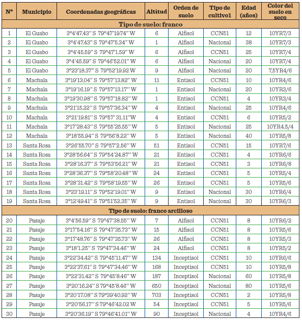 Se seleccionaron para el estudio 30 parcelas al azar (1 ha a 3 ha de superficie cada una), ubicadas: cinco en El Guabo, siete en Machala, siete en Santa Rosa y 11 en Pasaje (Figura 1; Tabla 1). La muestra estuvo conformada por 18 parcelas bajo el sistema monocultivo y cultivadas con CCN51, y por 12 parcelas cultivadas con Nacional, en asociación con árboles de plátano y cítricos. La edad de las plantas fluctuó para CCN51 de 2 a 25 años y para Nacional de 4 a 80 años.