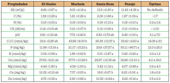 La SE, propiedad física del suelo relacionada con la absorción del agua y de nutrientes (Sarli y col., 1992), osciló entre 8.61 m2/g ± 4.14 m2/g (Machala) a 13.5 m2/g ± 4.20 m2/g (Santa Rosa) (Tabla 2). Valores que los clasifican como suelos altamente meteorizados (0 m2/g a 14.00 m2/g) y moderadamente meteorizados (15.00 m2/g a 20.00 m2/g); típicos de suelos tropicales (Fassbender y Bornemisza, 1987) y que pueden ocasionar problemas en la absorción del P por las plantas (López-Hernández y Bates Rondón, 2018).