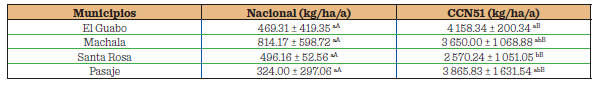 Los valores de rendimiento anual mostraron diferencia para el tipo de cacao (P < 0.05) pero no entre municipios para el cacaco Nacional (Tabla 3). El rendimiento de cacao fue superior en CCN51, con el registro más alto en los suelos de El Guabo (4 158.34 kg/ha/a ± 200.34 kg/ha/a), y el más bajo significativamente para Santa Rosa (2 570.24 kg/ha/a ± 1 051.05 kg/ha/a). Los promedios de Nacional tuvieron el valor más alto en Machala (814.17 kg/ha/a ± 598.72 kg/ha/a), y el más bajo en Pasaje (324.00 kg/ha/a ± 297.06 kg/ha/a).