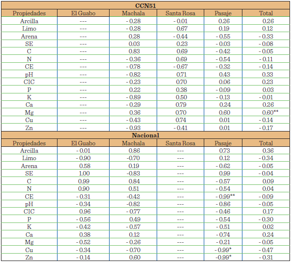 En la Tabla 4 se muestra la matriz de correlación de Pearson para los diferentes parámetros físicos y químicos de los suelos, y su asociación con el rendimiento de los cultivos de cacao. No se muestran valores de correlación para los cultivos obtenidos en El Guabo (CCN51) y Santa Rosa (Nacional), por tener solo dos poblaciones muestreadas en esos municipios. El rendimiento de CCN51 presentó una correlación positiva con la cantidad de magnesio disponible en el suelo, pero esta solo fue significativa al analizar en forma global todos los suelos (r = 0.60; P < 0.01). En el cultivo Nacional, en el municipio de Pasaje, se encontró una relación negativa significativa entre el rendimiento y el valor de CE (r = -0.99; P < 0.01), Cu (r = -0.99; P < 0.05) y Zn (r = -0.99; P < 0.05), lo que sugiere que, en dicha región, un excedente de esta propiedad fisicoquímica y nutrientes puede ser una limitante en la producción de cacao.
