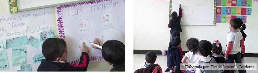 La maestra dibujaba en el pintarrón tres rectángulos, poniéndoles el signo de pesos, esto para que los alumnos pudieran identificar la cantidad de billetes manejados, posteriormente sentaba a los alumnos en el piso, en forma de media luna, para preguntarles cuáles eran los números que tenían los billetes.