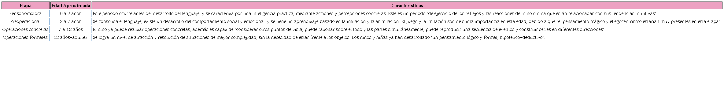 Duek (2010) hace un análisis de la Teoría del Desarrollo Cognitivo postulada por Piaget. Dicha teoría está conformada por cuatro etapas (Tabla 3), definidas por un periodo aproximado de tiempo, y con características específicas de desarrollo cognitivo. Para esta investigación, la etapa preoperacional tiene especial importancia, debido a que los estudiantes del nivel preescolar se encuentran precisamente en esta etapa.