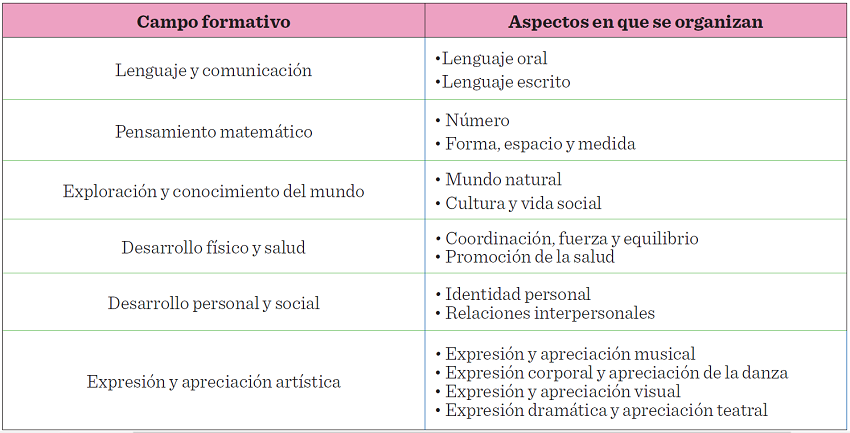 Fuenlabrada (2005) mencionó que, uno de los objetivos principales de la SEP, en sus distintos planes de estudio es el desarrollo de la autonomía en los niños sobre su control del aprendizaje. El Programa de Estudios 2011 del nivel Preescolar (SEP, 2013a), se organiza en 6 campos formativos (Tabla 1) que permiten identificar en qué aspectos del desarrollo y del aprendizaje se concentran las actividades escolares en ese periodo.