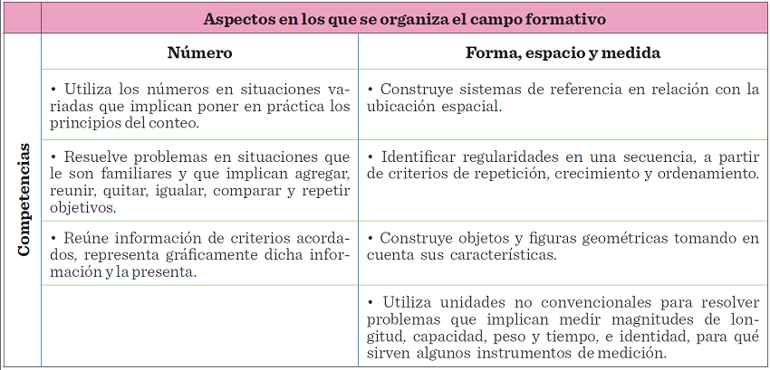 Para esta investigación, se retomó el campo formativo del pensamiento matemático, que se organiza en dos elementos que guardan relación con la construcción de nociones matemáticas elementales: forma, espacio y medida, y el número (SEP, 2013a). Otro apartado importante es el de las competencias, que influyen en los aprendizajes que se desean impartir, es decir, lo que se espera que cada alumno conozca en términos de saber, saber hacer y saber ser. En el campo formativo del pensamiento matemático existen varias competencias, que se indican en la Tabla 2.