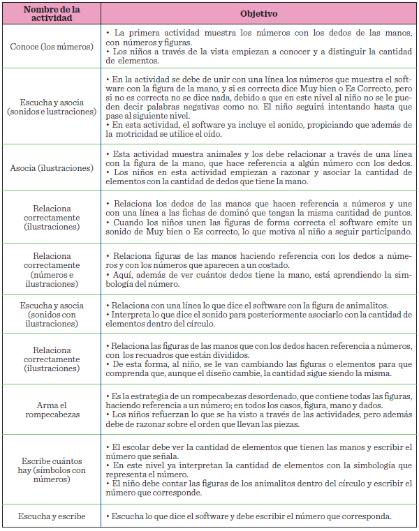 Se trabajan las actividades con el software, los primeros números por vía visual directa, además de escuchar y asociar los sonidos con los dedos, asociar el número de dedos con el número de figuras, relacionar figuras con los dedos, relacionar correctamente números y dedos, asociar la figura con el sonido, armar rompecabezas, imagen para escribir cuántos dedos hay, imagen para escribir cuántos objetos hay (Tabla 4), donde se busca que asocien imágenes de cada número con los instrumentos más usados en la escuela: los dedos de las manos, las regletas y los puntos de los dados.