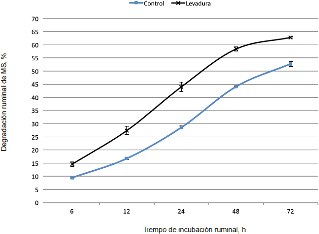 Los valores de tasa fraccional de degradación y degradabilidad efectiva del rastrojo de maíz incrementaron cuando se suplementó la dieta con levadura. En forma consistente, Chaucheyras-Durand y col. (2015), reportaron mejoras en la degradación de la fracción de fibra detergente neutro con la adición de Saccharomyces cerevisiae. Los autores atribuyeron el efecto de levadura viva sobre la degradación de sustratos fibrosos, por un aumento en la colonización microbial, adjudicando el efecto no únicamente al pH ruminal, sino también a la utilización de oxígeno ruminal por las células de levaduras, para una anaerobiosis más eficaz. En forma consistente, Ishaq y col. (2015) asociaron este efecto a una posible más rápida y efectiva colonización por microorganismos ruminales. Asimismo, Ruiz y col. (2016) observaron que la inoculación con Candida norvegensis, a sustratos fibrosos, favorecía el aprovechamiento de algunas fracciones altamente indigestibles, por promover la proliferación de microorganismos celulolíticos, para llevar a cabo una mejor fermentación ruminal. Promkot y col. (2013), atribuyeron que el uso de levaduras en rumiantes mejoraba el aprovechamiento de la MS y su capacidad fermentativa.