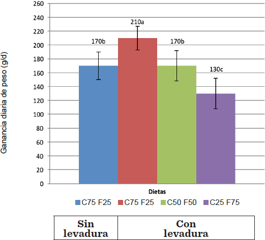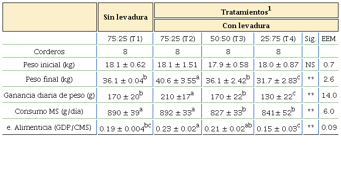 En este estudio, los ovinos alimentados en la dieta control (T1; con 25 % de forraje sin aditivo) mostraron similar ganancia de peso que los ovinos que recibieron la dieta de T3, en la cual, se incrementó el forraje hasta 50 % de la dieta, lo que representa un ahorro importante en la alimentación. Esto se debió al efecto benéfico de la suplementación de levadura; sin embargo, en la dieta de T4 (75 % de forraje más levadura), los ovinos presentaron la menor eficiencia productiva. Los ovinos que se alimentaron con la dieta de T2 (25 % de forraje más levadura) tuvieron la mayor ganancia de peso.