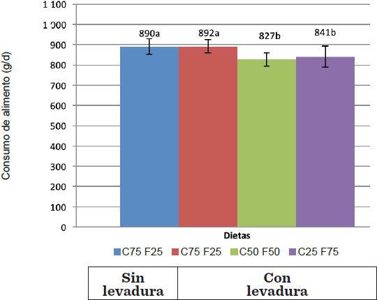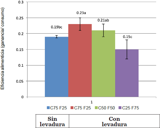 Los resultados se muestran en la Tabla 4. La mayor GDP se observó en los ovinos en la dieta con 75 % concentrado + levadura (T2); mientras que la menor GDP (P < 0.05) se observó en los ovinos en la dieta con 25 % de concentrado + levadura (T4). La GDP en los ovinos en la dieta con 75 % concentrado sin levadura (T1) y los de la dieta con 50 % de concentrado + levadura (T3) fue similar (P > 0.05), pero fue menor a los ovinos de T2 y mayor que T4 (P < 0.05). En la Figura 2 se muestra la GDP obtenida por los ovinos en las dietas experimentales. Como se observa en la Figura 3, el consumo de MS fue similar en los ovinos que recibieron las dietas con el mismo contenido de concentrado sin (T1) y con (T2) levadura (P > 0.05), y este fue mayor (P < 0.05) que en los ovinos que recibieron las dietas con menor cantidad de concentrado y levadura (T3 y T4). En la Figura 4, se aprecia que la eficiencia alimenticia fue mayor (P < 0.05) en los ovinos que recibieron la dieta con 75 % de concentrado más levadura (T2), que los ovinos que recibieron la dieta con el mismo nivel de concentrado pero sin levadura (T1). También se observa que la eficiencia alimenticia fue similar en los ovinos de T2 y T3 (P > 0.05), y fue menor en los ovinos de T4 (P < 0.05).