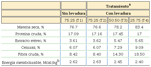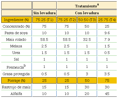 Se probaron 4 dietas diferentes que variaron en cuanto a la proporción de concentrado y forraje suministrado (T1: 75:25; T2: 75:25, T3: 50:50; y T4: 25:75). Los ingredientes que se incluyeron en el concentrado fueron maíz rolado, pasta de soya, melaza, urea, sal común, premezcla de minerales para ovinos, y grasa protegida. Los forrajes considerados en las dietas fueron rastrojo de maíz y heno de alfalfa. La proporción de ingredientes de cada dieta se muestra en la Tabla 1. Todos los ingredientes considerados en las dietas se compraron con un proveedor local dedicado a la venta de alimentos para animales. Las dietas fueron preparadas en el taller de alimentos balanceados de la Facultad de Zootecnia y Ecología, de la Universidad Autónoma de Chihuahua. Las dietas fueron balanceadas con similar contenido de proteína, pero el nivel de energía disminuyó con el incremento en la proporción de forraje en la dieta (Tabla 2), cuya composición química fue determinada de acuerdo a la Asociación de Químicos Analíticos Oficiales (AOAC, por sus siglas en inglés: Association Official Analytical Chemists) (AOAC, 2005). Todos los corderos con excepción del T1 fueron suplementados con el probiótico líquido, mezclado diariamente en la ración, a razón de 15 mL/kg de peso vivo, equivalente a 5 g/d de levadura en base seca del probiótico en estudio. La dosis se estimó en base a estudios previos (Ruiz y col., 2016), y de esta forma mantener la actividad probiótica de la levadura.