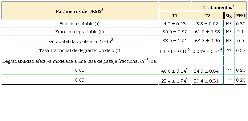 Las constantes de tasa de pasaje ruminal (k) a 1 %/h y 5 %/h fueron usadas para calcular la degradación efectiva (DE) de la MS de acuerdo al modelo de Ørskov y McDonald (1979):