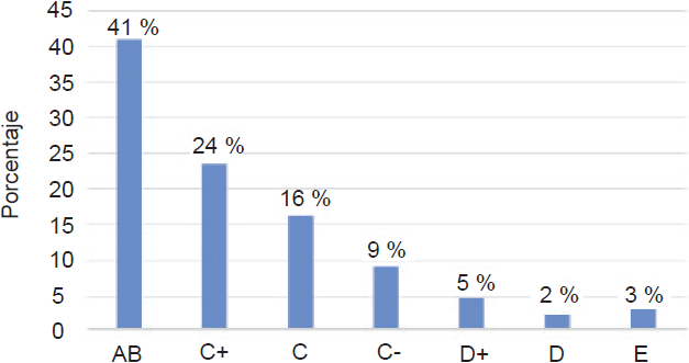 El sur de Tamaulipas posee una zona metropolitana integrada por los municipios de Tampico, Ciudad Madero y Altamira. De acuerdo con el INEGI (2015), en estos tres municipios habitan 706 771 personas, de las cuales, los jóvenes de entre 15 y 29 años representan el 25 % (INEGI, 2019b). En cuanto a conexión y usuarios de Internet, la ciudad de Tampico está entre las más conectadas a nivel nacional, alcanzando a 7 de cada 10 personas, mientras que en los municipios de Ciudad Madero y Altamira esta cifra es de 6 por cada 10 personas (INEGI, 2019a). Referente a las características socioeconómicas de los participantes, es posible observar que el 65 % de los jóvenes pertenecen a los dos estratos más altos (AB y C+), y se extienden hasta el 81 % de la población estudiada si se considera el nivel C, según la metodología de medición de la Asociación Mexicana de Agencias de Inteligencia de Mercado y Opinión Pública (AMAI, 2018). En términos generales, algunos estudios indican que los estratos de mayor nivel son los que tienen acceso a la educación media superior y superior en México (Tapia y Valenti, 2016; Blanco, 2017), tendencia que se ve corroborada en este estudio (Figura 1), ya que la población de bajos recursos representó solo el 19 %.