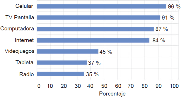 Un aspecto relevante en el estudio del uso y apropiación de las TIC es determinar el acceso que tienen las poblaciones de entrar a las tecnologías digitales en diferentes entornos. En este estudio, se encontró que es una tendencia general la conexión múltiple y ubicua, a partir de dispositivos propios. Los más relevantes fueron el celular (96 % posee un aparato propio, 72 % de tipo smartphone, 50 % con plan de datos), la televisión o pantalla (91 % posee una propia, 80 % con suscripción de paga y conexión a Internet), la computadora (87 % mencionó poseer una personal, 53 % indicó que es de escritorio o PC, 73 % con conexión a Internet) e Internet (84 % señaló que su hogar paga este servicio). Menos relevantes fueron otras tecnologías -como los videojuegos, tabletas e incluso la radio-, ya que están presentes en menos de la mitad de los hogares (Figura 2). En este sentido, se puede plantear que el acceso es generalizado, y no constituye una variable predictora del nivel de interacción en la red.