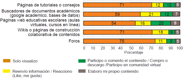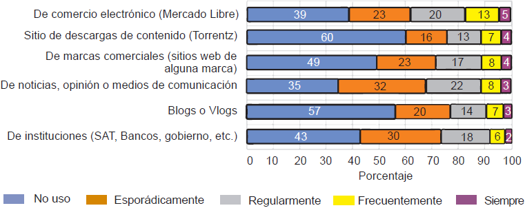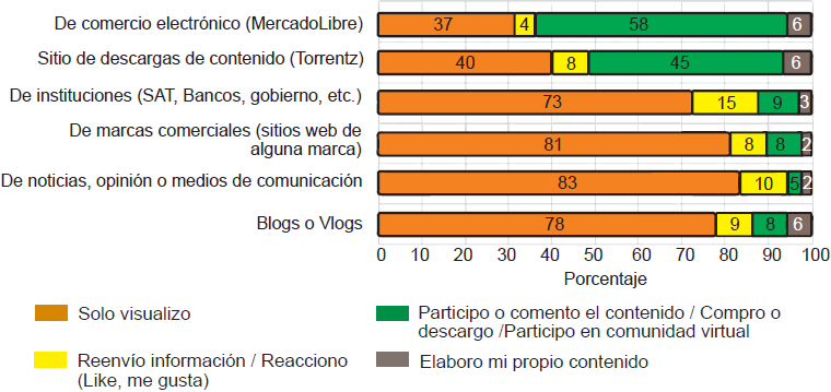 En cuanto al tipo de navegación en estas mismas plataformas (entre aquellos que mencionaron emplearlas ya sea esporádicamente, de manera regular, frecuentemente o siempre) el perfil preponderante es el de visualización, que involucra visitar el sitio y navegar en él. Destacan con mayores niveles de interacción las páginas de comercio electrónico, en las que el 58 % mencionó participar en ellas activamente, comentando, comprando o intercambiando; asimismo, los sitios de descargas de contenidos con un 45 % (Figura 4). En términos generales, la producción de contenido propio es poco significativa, pero también destaca que este tipo de páginas no sean relevantes en la navegación de los jóvenes, puesto que comparten poca información sobre ellas. Lo anterior, puede relacionarse con la baja frecuencia de uso, ya que no las utilizan o lo hacen esporádicamente. Aunque cabe destacar, que aquellos que navegan de forma regular o frecuente tienen un perfil activo, ya que forman parte de alguna comunidad virtual, realizan transacciones de información o bienes y elaboran sus propias publicaciones. En términos de habilidades digitales, esto muestra un potencial que claramente podría ser aprovechado en el contexto educativo, pues se trata de actividades que pueden ser significativas para las necesidades e intereses de estos jóvenes.
