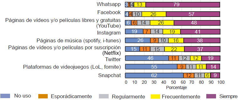En segundo lugar, se evaluaron las plataformas asociadas con el entretenimiento, la socialización y comunicación. Entre las principales, destaca la aplicación de WhatsApp (92 % mencionó usarla siempre y frecuentemente), seguida de la red social digital, Facebook (83 %) y de páginas de videos y/o películas libres o gratuitas como YouTube (74 %), así como el portal de Netflix o páginas de videos y/o películas por suscripción (59 %). Por otra parte, las plataformas sociales con menos frecuencia de uso fueron Snapchat, los videojuegos en línea y Twitter (Figura 5).