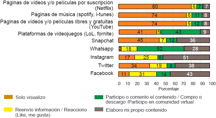 Respecto al uso de las plataformas digitales por parte de los jóvenes, la Encuesta Nacional sobre Disponibilidad y Uso de Tecnologías de la Información en los Hogares de México (INEGI, 2019a) señala que las tres principales actividades se pueden clasificar en el rubro de entretenimiento (90.5 %), comunicación (90.3 %) y obtención de información (86.9 %). No obstante, estas interacciones suelen ser más complejas que la simple navegación para fines ludicos, de socialización o académicos, ya que se concatenan con una más amplia gama de agencias, colaboración e intercambio de recursos (Lago-Martínez, 2015).