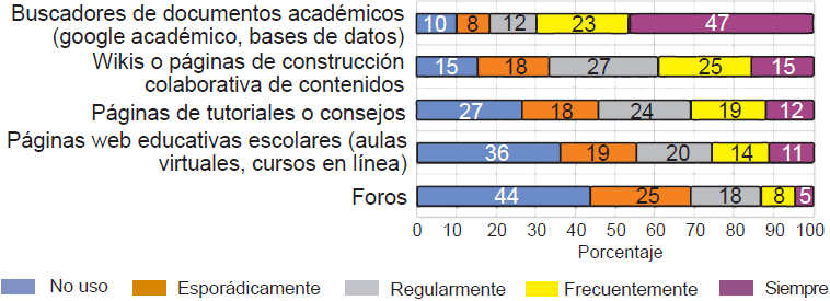 Por último, también se consultó respecto al uso de ciertas páginas que pueden emplearse con fines académicos, dentro de la escuela o para el aprendizaje extraescolar de los jóvenes. Los resultados permiten ver que esta otra tipología de escenarios digitales genera dinámicas de uso diferenciado. En primer lugar, los buscadores de documentos como el Google académico y otras bases de datos fueron los más relevantes en cuanto a frecuencia de uso (70 % refirió usarlos siempre y frecuentemente). Otras plataformas de construcción colectiva del conocimiento, como las wikis son usadas de manera regular, pero sólo con fines de visualización de contenidos (27 % comentó tener un uso regular y 40 % dijo usarlas siempre y frecuente). En estos hallazgos, también destaca que los espacios de aprendizaje no formal, como las páginas de tutoriales y consejos, que pueden ser relevantes por constituirse en comunidades de práctica y proveer un acercamiento más lúdico a contenidos de diversa índole, tampoco resultaron ser plataformas tan importantes (27 % nunca la usa, y18%lo hace esporádicamente). En cuanto a las páginas web de las instituciones educativas, como aulas virtuales y cursos en línea, tampoco tienen mayor relevancia en la navegación de los participantes (36 % nunca la usa, y19%lo hace esporádicamente. Finalmente, los foros son las plataformas menos empleadas por estos jóvenes (44 % nunca los usa y25% esporádicamente) (Figura 7).