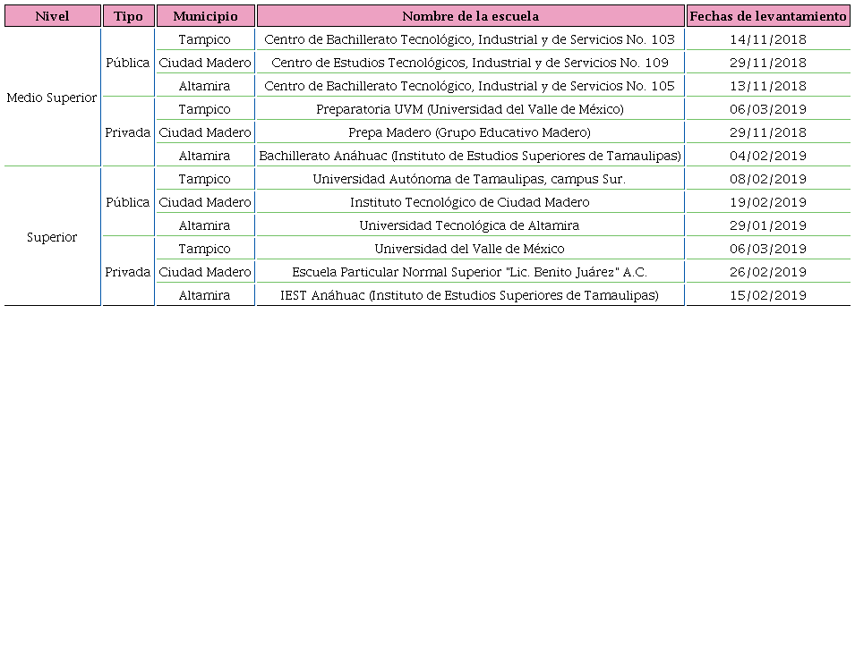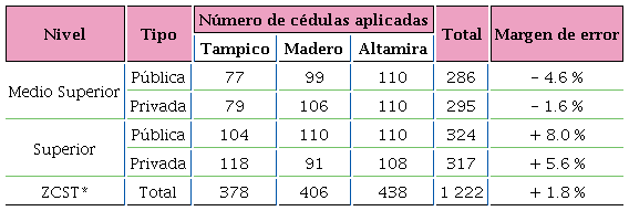 El marco muestral se elaboró con el listado de las instituciones de educación media superior y superior, de escuelas públicas y privadas de los municipios que conforman la zona conurbada del sur de Tamaulipas (Tampico, Ciudad Madero y Altamira). A partir de lo anterior, se diseñó una muestra estadísticamente representativa de la zona, con un 95 % de nivel de confianza que corresponde a 300 cédulas en escuelas públicas y privadas y 600 cédulas en media superior. El trabajo de campo permitió obtener 1 222 cédulas, con margen de error de +/- 2 % a +/- 5 % del muestreo planeado (Tabla 1). A través de un método aleatorio simple, se seleccionó una institución educativa de cada municipio, de cada nivel educativo y de cada tipo, y se aplicaron los cuestionarios dentro de la escuela a partir de una muestra incidental, es decir, en las áreas comunes de la institución, donde se solicitó la participación voluntaria de los estudiantes (Tabla 1). Los nombres de las escuelas participantes y las fechas de levantamiento de cada una se describen en la Tabla 2.